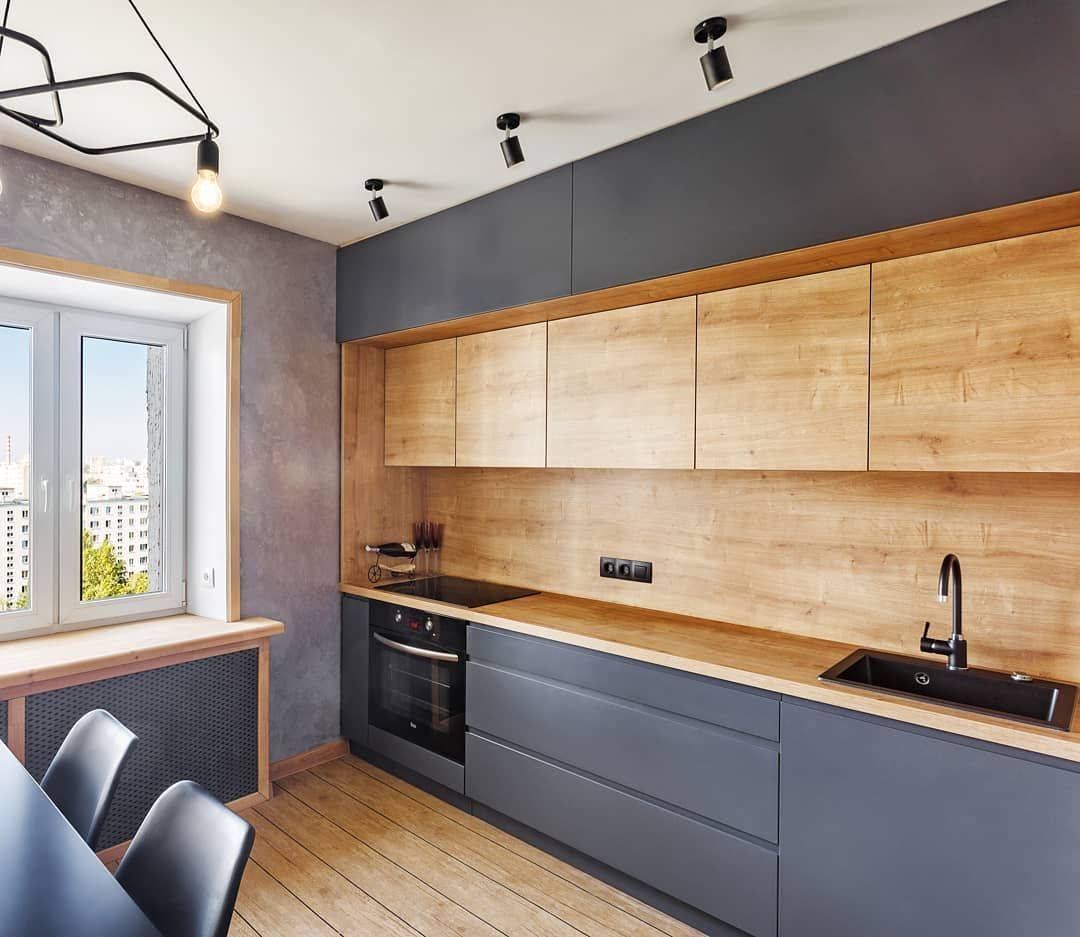 | Рис. 14. Шкафы под антресолями одного светлого древесного декора со столешницей, фартуком, боковыми панелями |