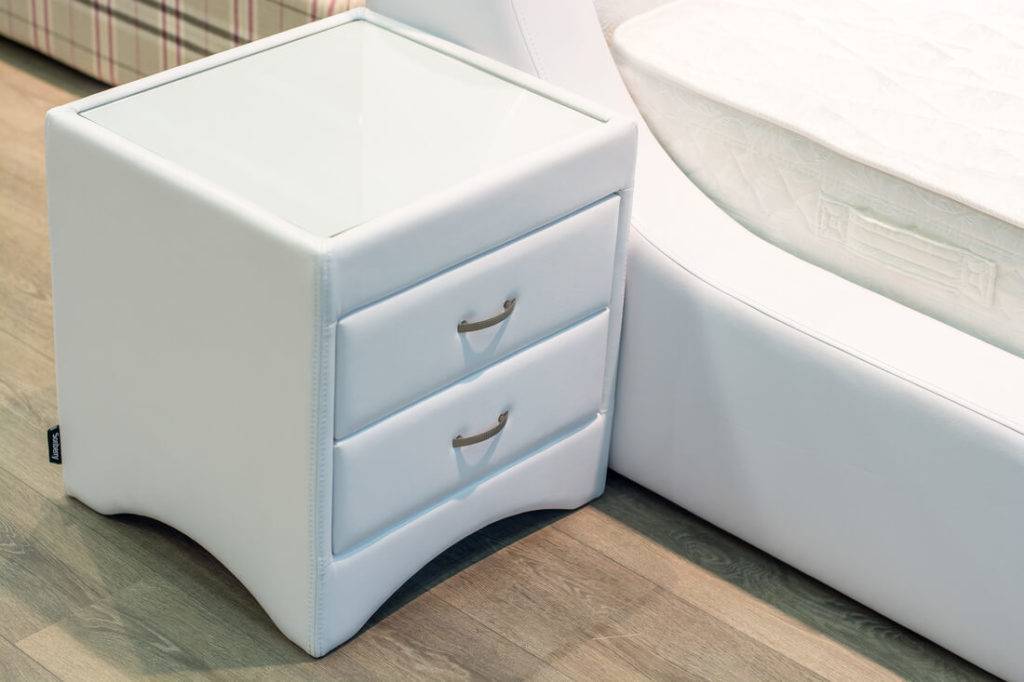 если охота сделать спальню еще более изысканной, то можно выбрать тумбу с обивкой из кожи. Выглядят подобные изделия эффектно, при случайном ударе травму получить сложно, да еще и в эксплуатации они практичны.