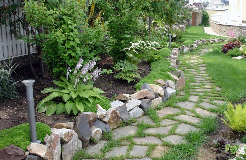 Использование разных покрытий не только визуально увеличивает участок, но и позволяет облагородить участок несколькими видами растений, например, можно сочетать газон с галькой и гравием. Кроме того, для оформления садовых дорожек можно использовать тротуарную плитку, бетон или кирпич, при этом четких границ не будет, а создастся плавное перетекание из одной области в другую. Например, на газоне можно проложить дорожку из гравия, а вот на участке из гальки можно сделать элемент озеленения, расположив там альпийскую горку.