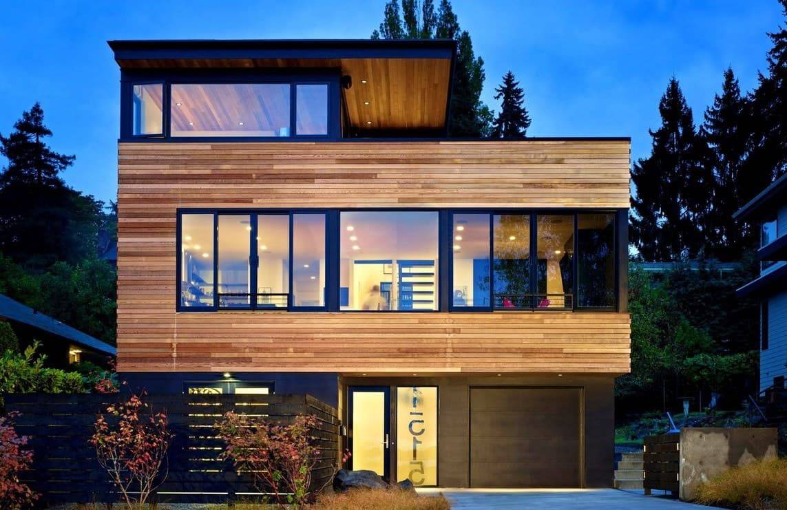 При помощи фантазии опытного архитектора коттедж с плоской крышей из металла, бетона и натурального дерева с большим количеством окон строгих прямоугольных либо динамичных форм и качественные фасадные материалы превратят ваше жилище в настоящее произведение искусства. Дополнительным украшением выступит каминная труба со стороны фасада, выложенная дикими камнями, это всегда смотрится оригинально и оживляет весь вид здания.