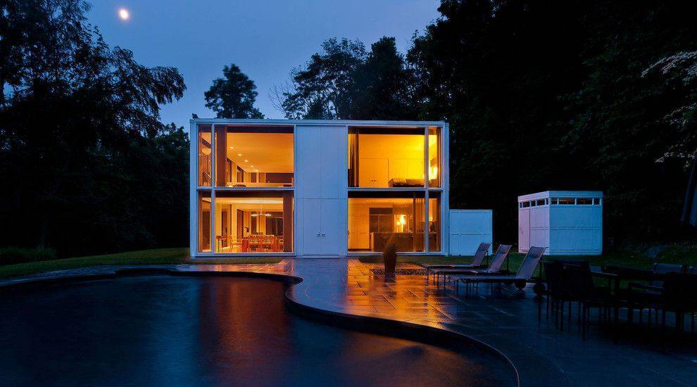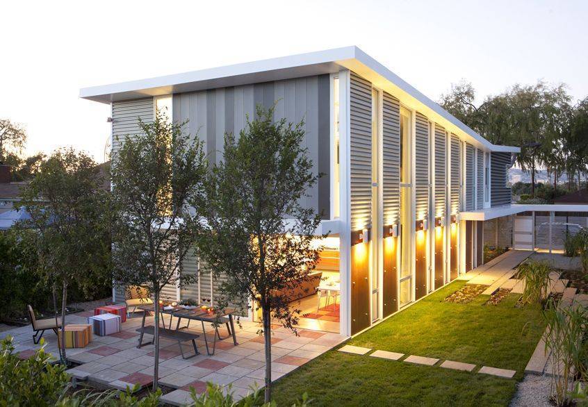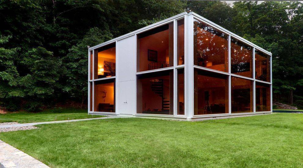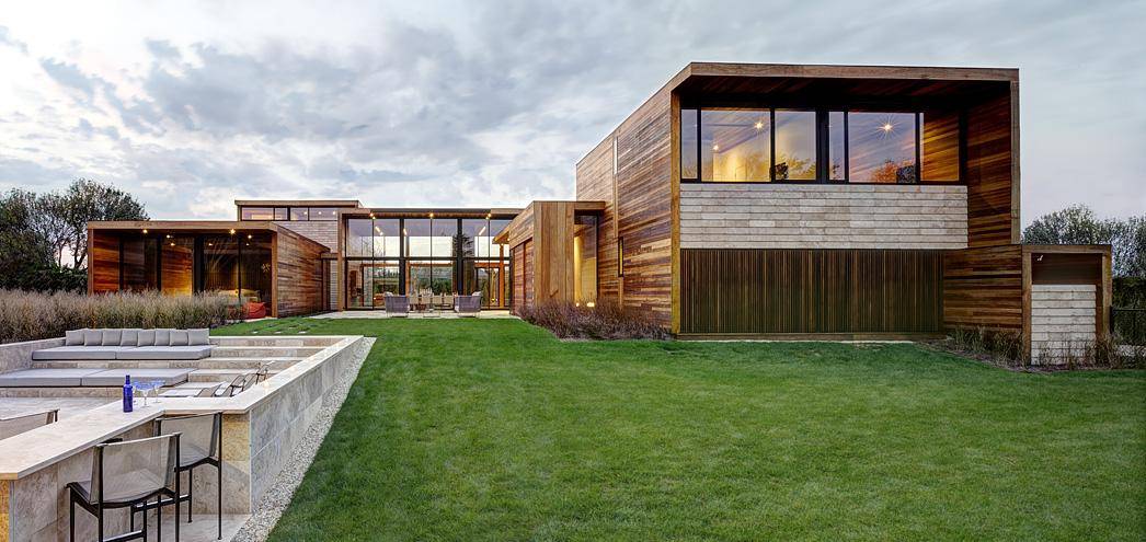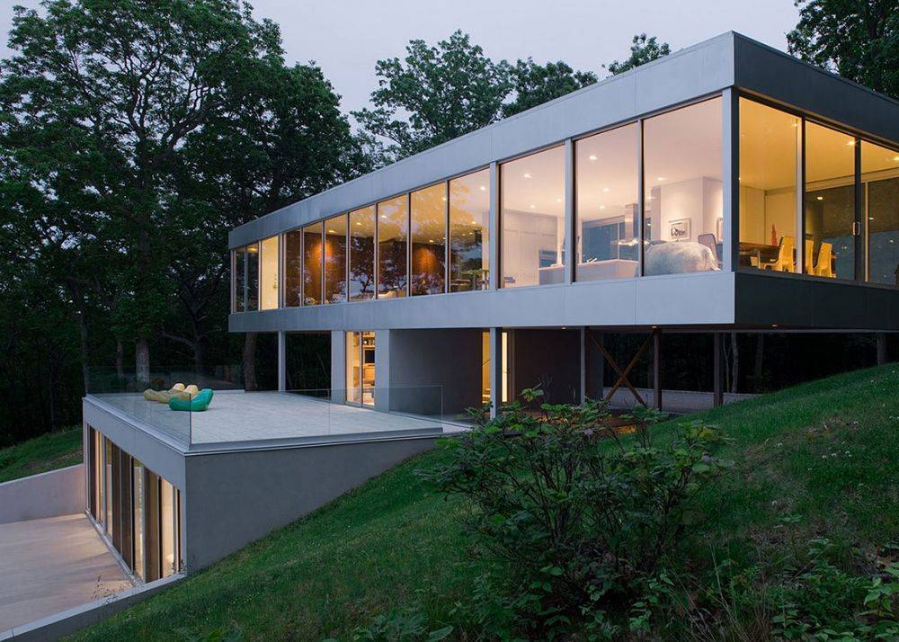 Что касается экстерьера, то дома в данном стиле всегда очень большие. За счет этого обеспечивается внутренний простор с минимальным количеством перегородок и стен. Это же касается и окон, которые должны быть большого размера. Довольно часто такие дома имеют застекленный фасад, что выглядит потрясающе красиво.