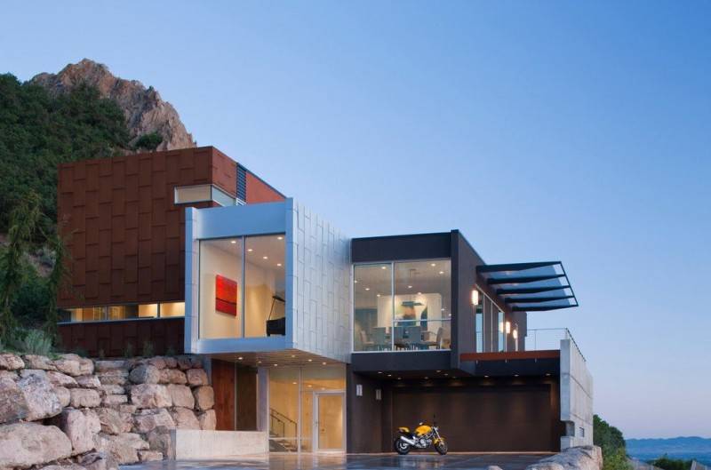 Первое, что характеризует такие дома – лаконичность. Такой эффект достигается благодаря использованию материалов с гладкой фактурой и блеском. К ним относятся бетонные конструкции, стекло и металл. Они хорошо между собой сочетаются, а особенно в отделке дома.