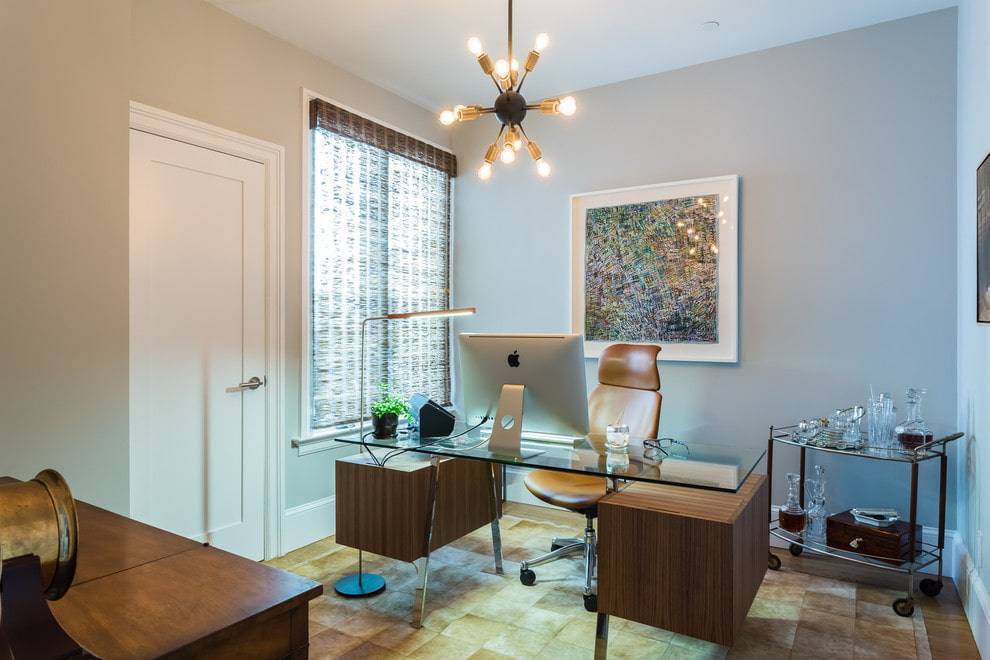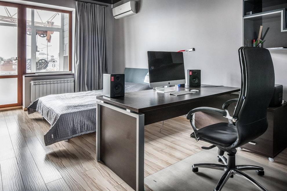 Если позволяет площадь квартиры, для домашнего офиса можно выделить отдельную комнату, например, гостиную. Это наиболее удобный вариант для фрилансеров, переводчиков, тех, кто работает дома и кому требуется полная тишина для работы.