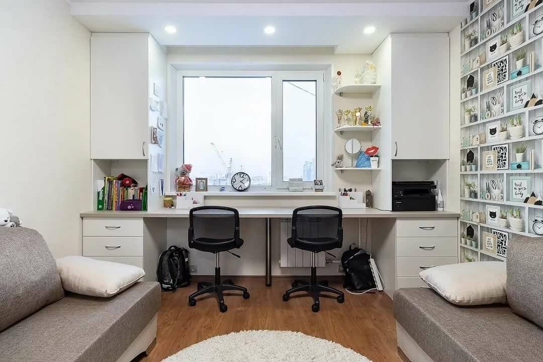 Чтобы не закрывать доступ к окну, можно поставить компактный стол ФОТО: академия-мебели29.рфМассивные комплексы с большим количеством полок подойдут для небольшой комнаты, в которой нет комода или шкафа ФОТО: i.pinimg.comЕсли в семье два ребёнка, то важно создать для каждого школьника отдельную площадь ФОТО: 2.bp.blogspot.com