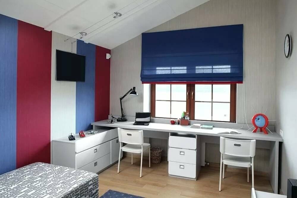 В детской с рабочей зоной у окна лучше использовать короткие шторы. На фото выше — рулонные шторы «день-ночь». Их можно регулировать по высоте и степени освещенности комнаты.