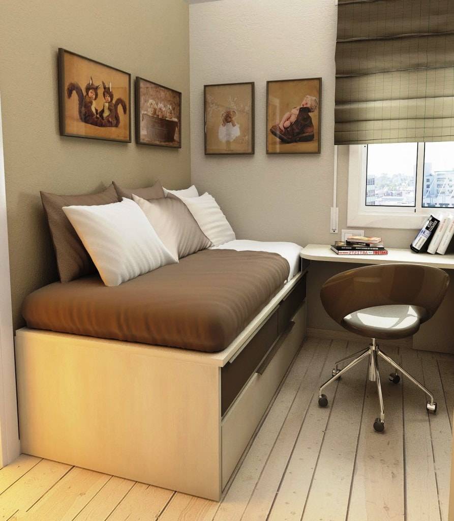 Угловые столы помогают освободить место в комнате для шкафа, кровати или техники. Но если места совсем мало, то рекомендуется разместить в комнате кровать-чердак, а рабочую зону — под ней.