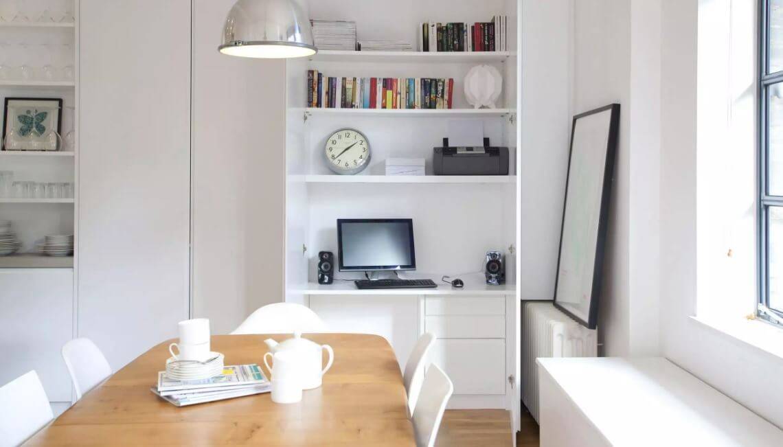 Если же занятия требуют концентрации и повышенного внимания, стоит убрать рабочее место подальше от телевизора. Работающий будет меньше отвлекаться, если сядет спиной к гостиной. Стол при этом можно установить в промежутке между шкафами или между шкафом и стеной. Такая импровизированная ниша создаст чувство обособленности от всего вокруг происходящего и поможет настроиться на рабочий лад.