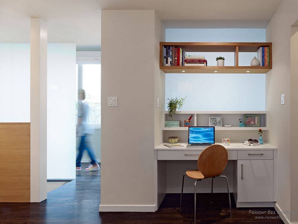 Отлично вписываются в небольшое пространство столы-подоконники или вмонтированные в стену. Наличие выдвижной секретной части выступает плюсом, поскольку туда можно прятать вещи после работы. И они не останутся на виду в комнате, которая предназначена для отдыха.