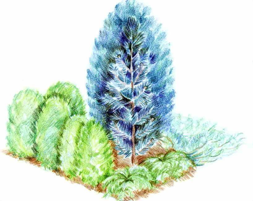 В такой композиции будет хорошо смотреться ель колючая, с голубовато-белым цветом хвои. Высота выбранного сорта не должна быть более 3- 4 метров.