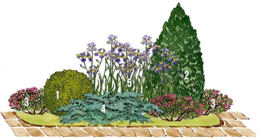 1.Туя западная «Globosa» 2.Кипорисовик горохоплодный 3. Спирея Бумальда «Froebelli» 4. Можжевельник чешуйчатый «Blue Сarpet» 5. Ирис гибридный.