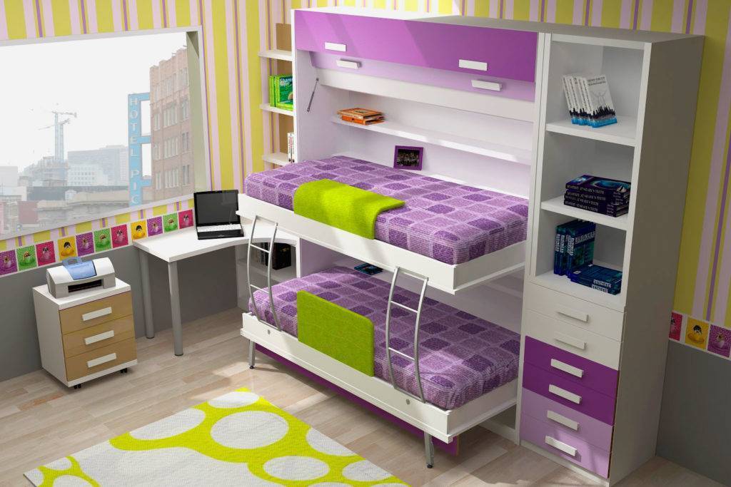 Когда в доме двое детей, а комната у них одна, встает вопрос экономии места. Рассмотрите возможность покупки двухъярусной кровати – она не только освободит площадь детской для игр, но и послужит своеобразным тренажером, а также местом для игр. Обычно два спальных места расположены одно над другим, иногда со сдвигом друг относительно друга. На «второй этаж» ребенок поднимается по специальной лесенке – она может быть совсем простой, напоминающей «шведскую» стенку, или более сложной, с широкими ступенями, под которыми могут располагаться ящики для игрушек.