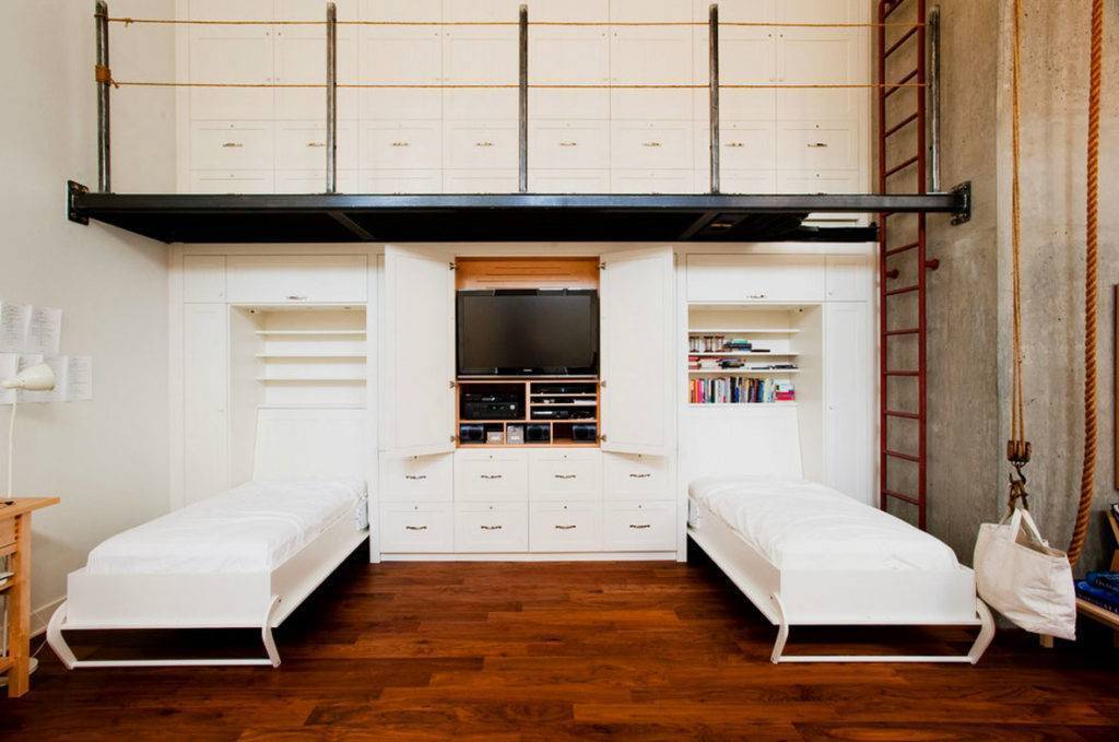 - трансформируемыми – днем нижняя кровать переворачивается, становясь столешницей. Это решение помогает сэкономить квадратные метры;