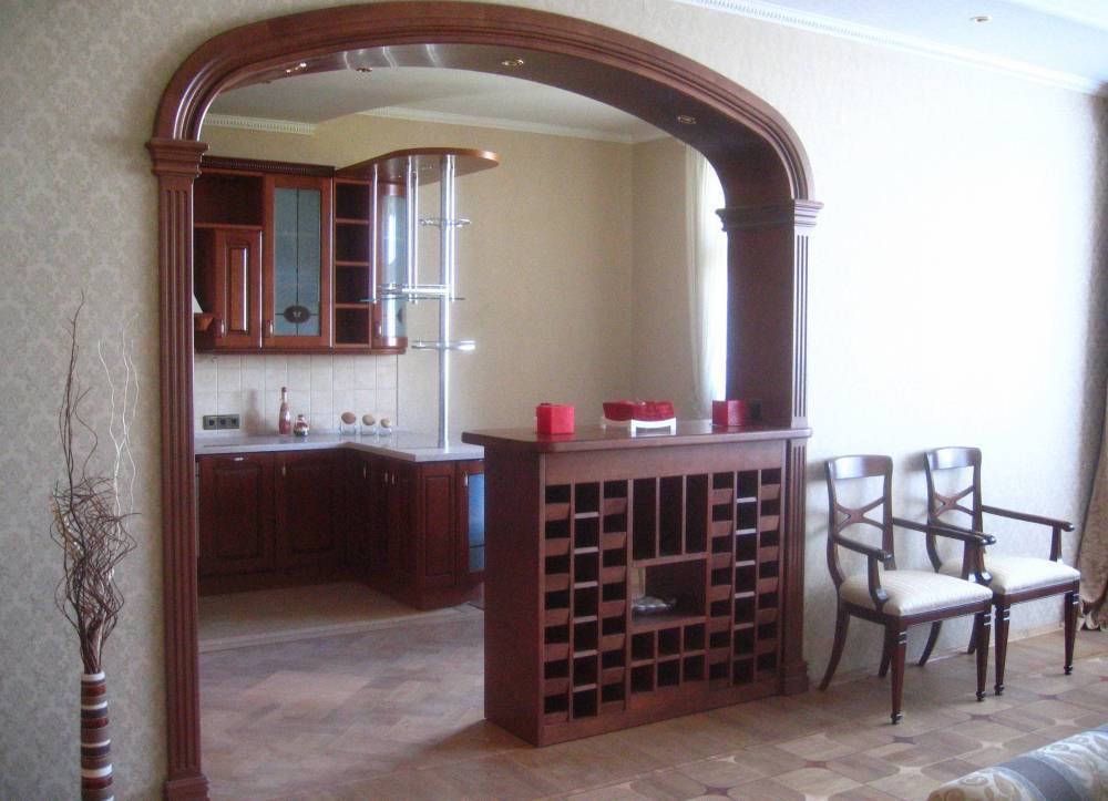 Стойка-перегородка чаще всего разделяет пространство между кухней и гостиной. Высота конструкции может варьироваться от 110 до 130 см. К таким перегородкам подходят барные стулья высотой 75—85 см. Для придания бару красоты и оригинальности, его можно дополнительно оснастить подсветкой.