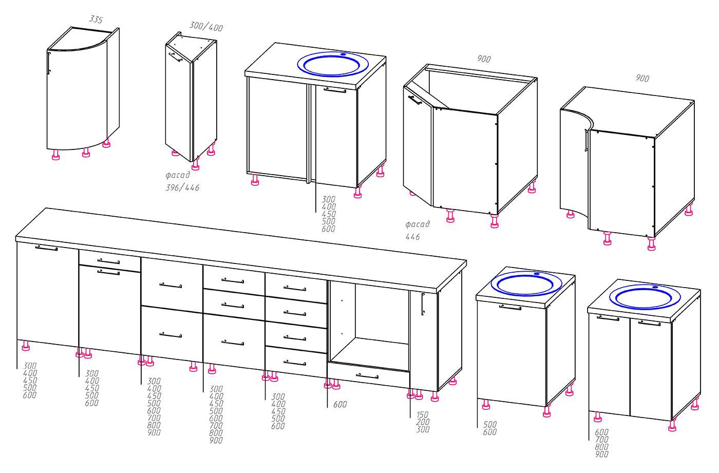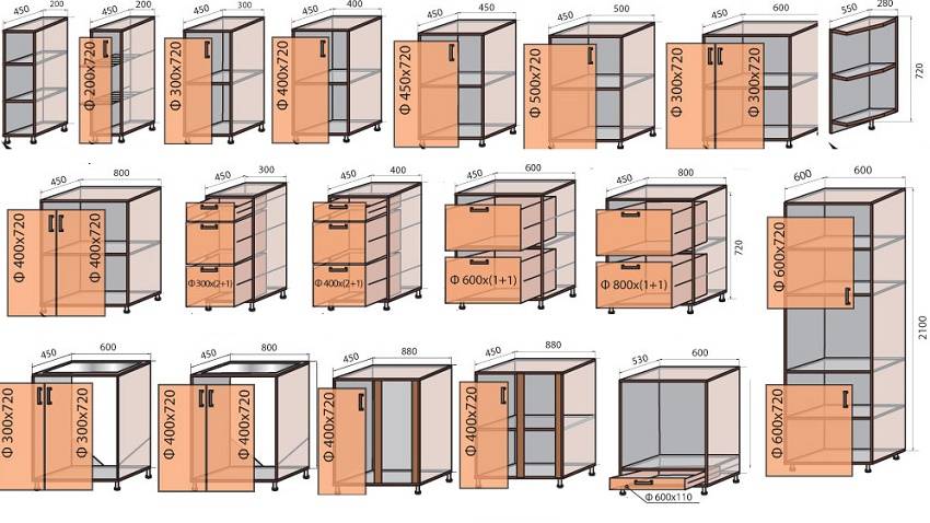 Деталировка основных кухонных шкафов: чертежи и размеры