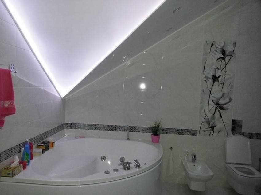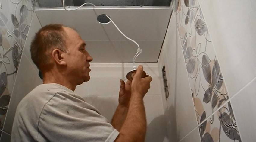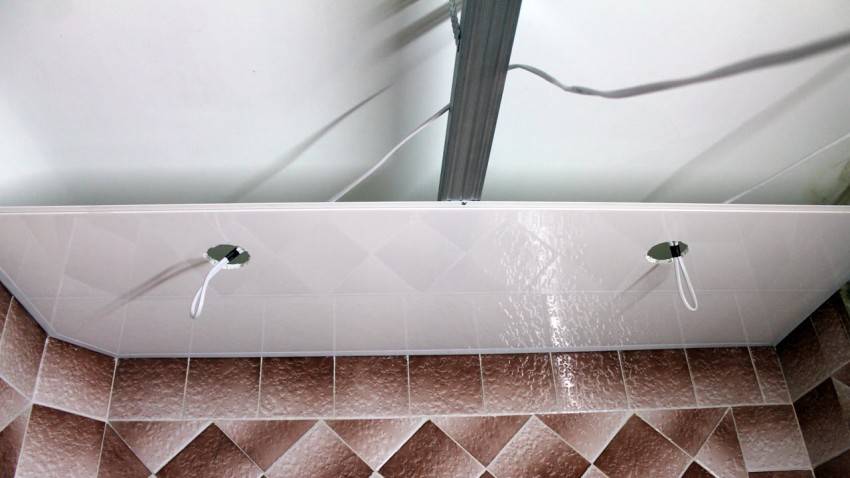 После этого нанесите разметку маркером или карандашом. Определитесь на сколько сантиметров от потолка будет расположена конструкция. Расстояние основывается на ширине корпуса осветительных приборов. Так как в ванну чаще всего ставят точечные светильники, то нужное расстояние примерно 5 см. Если же корпус широкий, то отступить нужно больше.
