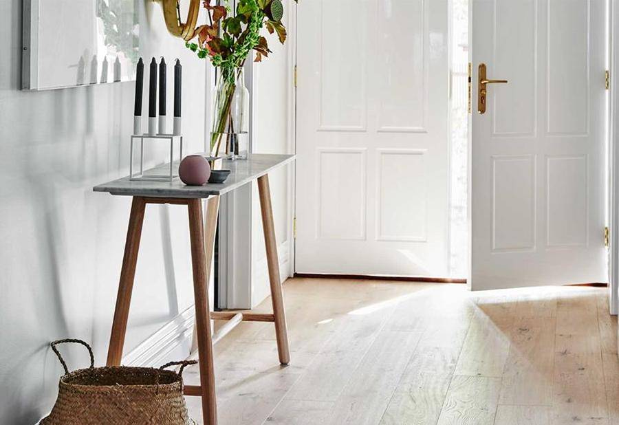 Для создания модного дизайна и экономии средств напольные покрытия можно комбинировать (плитку положить на входе, а оставшуюся площадь покрыть ламинатом). Если же покрытие полов в прихожей разместить несколько дальше за ее периметр, продолжив его на территорию кухни или в гостиной, то короткое помещение визуально станет длиннее.