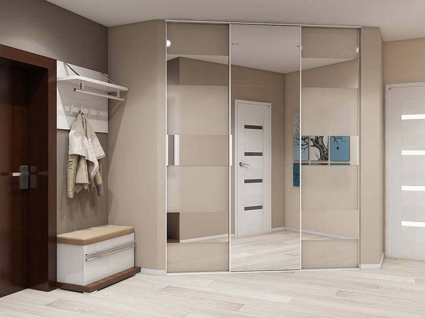 Просторный свободный угол — идеальное место для установки гардеробной. Это может быть напрямую скошенный угловой шкаф или выпуклой формы. Последний вариант практичней, внутри гардеробной образуется дополнительная площадь. Он эффектнее смотрится в дизайне интерьера прихожей, более эргономичная форма.