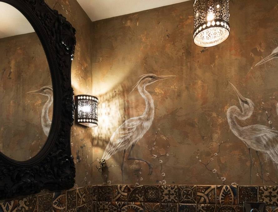 4. Особенности техники нанесения. Используя энкаустику, изображения наносятся красками с воском. Оригинально выглядит сграфитто, где стены сначала грунтуют черным цветом, потом белым, а затем выскабливают отдельные места, чтобы рисунок проступил. В технике алсекко смеси-краски наносятся на сухую штукатурку.