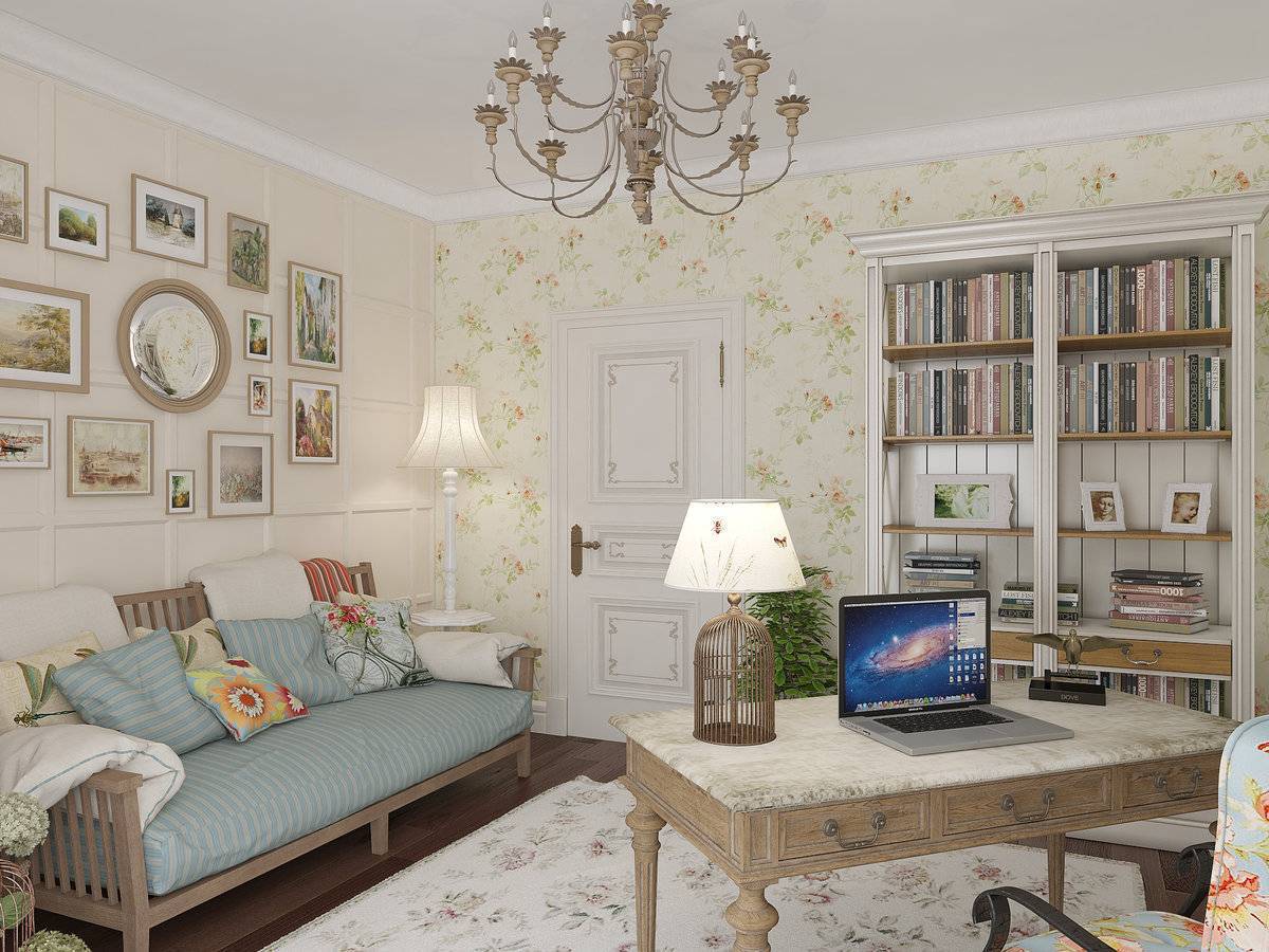 Если комната небольшая и оформлена в уютном стиле кантри, Прованс и таких подобных – разместите много маленьких квадратных картинок и легких деревянных рамочках