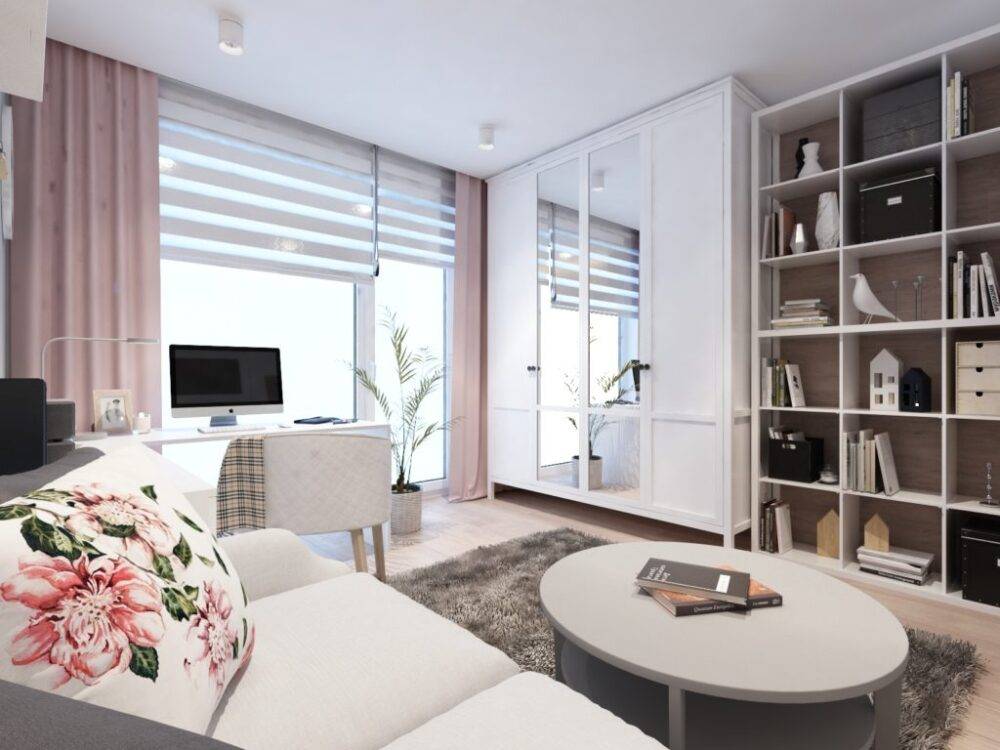 Такой интерьер понравится креативным молодым людям, приверженцам нестандартности во всем, включая дизайн помещений. Для обустройства можно использовать необычную мягкую мебель, вращающиеся полки и оригинальные системы хранения.