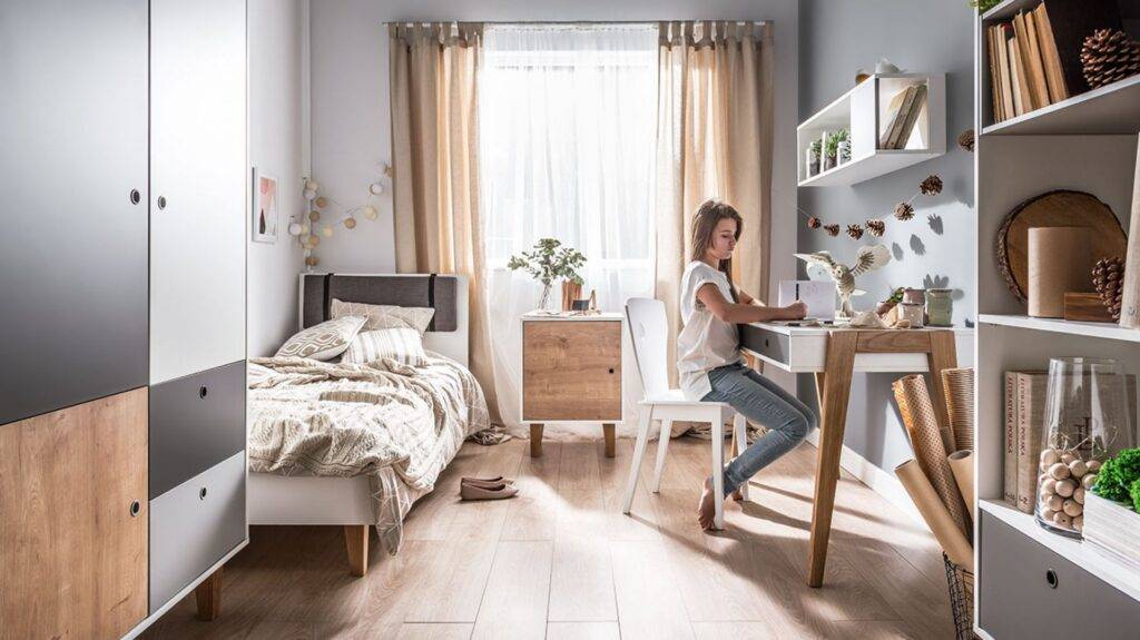 Если возможно, освободите место для домашних заданий и проектов с письменным столом или учебным пространством. Постарайтесь, чтобы отвлечения в этой области были минимальными, если это возможно, чтобы девочка-подросток, могла сосредоточиться на задаче. Еще одно пространство, которое ей может понадобиться, — это область для подготовки. Небольшое зеркало и стол добавят пространство для хранения средств макияжа или аксессуаров.
