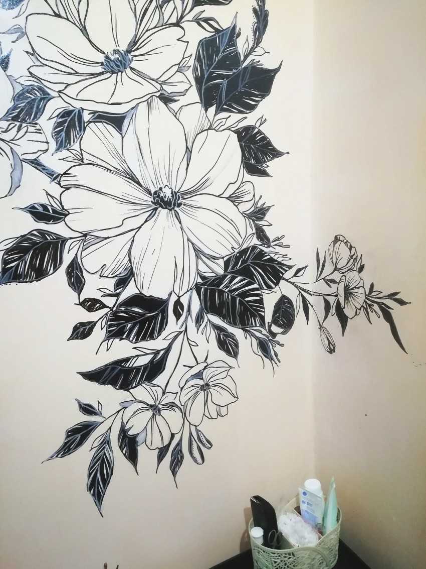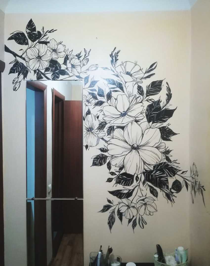 Небрежными мазками шпателя на стене изображены абстрактные цветки.