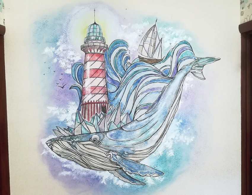 Морская тематика — главный мотив, который, можно с уверенностью говорить, никогда не исчезнет из комнат, где мы остаемся с одной из четырех стихий один на один. Хаотично разбросанные по всей площади стены пузыри, невозмутимые и загадочные дельфины, невероятно красивые медузы — вспомните свое настроение, когда вы последний раз отдыхали на море, и попытайтесь передать его через рисунок в своей квартире.