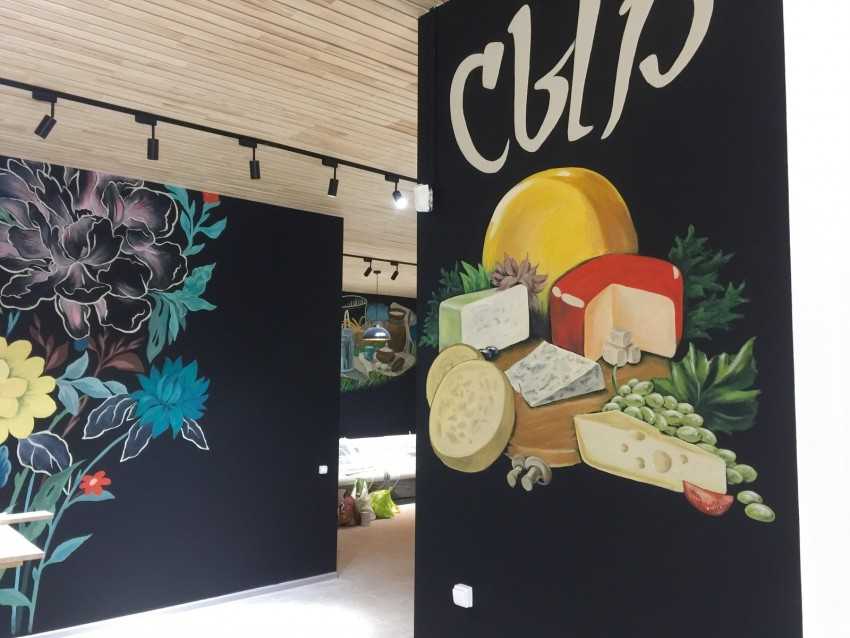 Оптимальное решение для кухни – роспись стен в интерьере натюрмортами из фруктов и овощей, изображениями любой еды. Многие смогут нарисовать тарелку с фруктами или головку сыра. Главное — подобрать несложный рисунок.