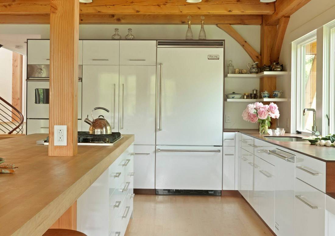 Если вы планируете приобретать встроенную технику, то подрозетник следует предусматривать сбоку. Идеальным месторасположением считается ближайший шкаф. Расстояние до холодильника должно быть до 200 мм, а от поверхности пола примерно 200 – 750 мм.