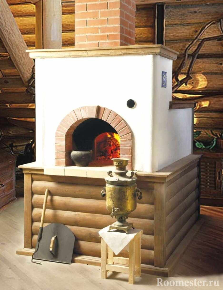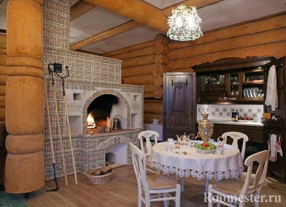 В русской избе классический интерьер обычно оформлен из деревянных материалов. В помещение при этом прекрасно вписывается классическая печь, сделанная из кирпича или глины, отделанная декоративными материалами. Она отличается рядом особенностей:
