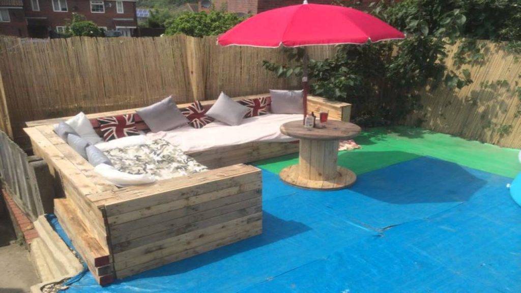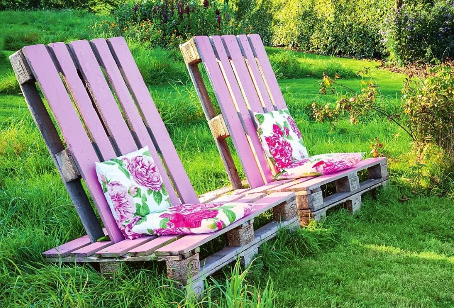 Зону отдыха можно декорировать шезлонгами. Для их изготовления вам понадобятся 3 поддона – 2 прямоугольных и 1 квадратный (он будет шире на 10 см, чем остальные).
