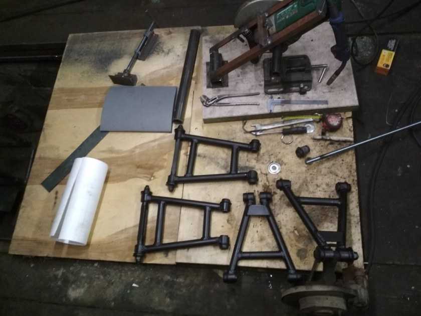 - К оси ведущей ступицы приваривают поворотный рычаг.