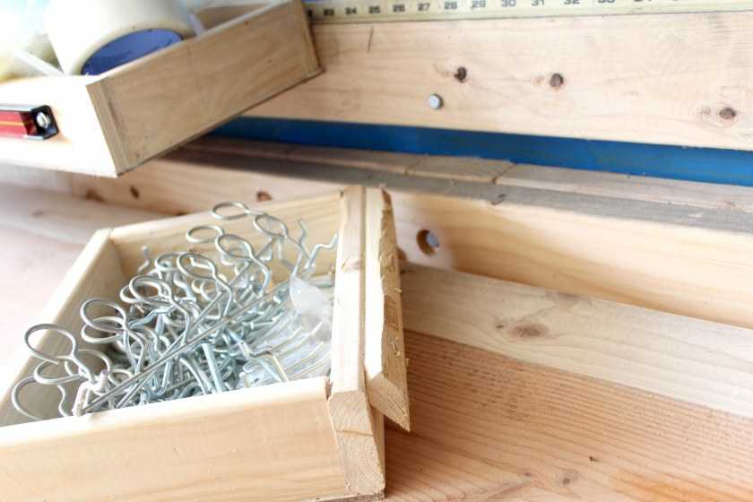 Такой же вариант, как и представленный на фото, можно использовать в самоделках для дачи, там ведь тоже часто нужно обустраивать мастерскую, причем места для нее выделяют даже меньше, чем остается в гараже. Для такой конструкции вам необходимо будет соорудить каркас из деревянных досок, а по верхнему и нижнему его ребру сделать надсечки, куда будут вставляться ячейки. Скорее всего, вдохновением для такой конструкции послужили классические ульи, которые используются при разведении пчел, система тут точно такая же. Листы, которые вставляются внутрь имеют перфорированную поверхность и наличие этих небольших дырочек позволит вам вкрутить внутрь гвоздики, повесить крючки, чтобы развесить инструменты и полезные девайсы максимально удобно, чтобы они не слетали при выдвигании и задвигании.