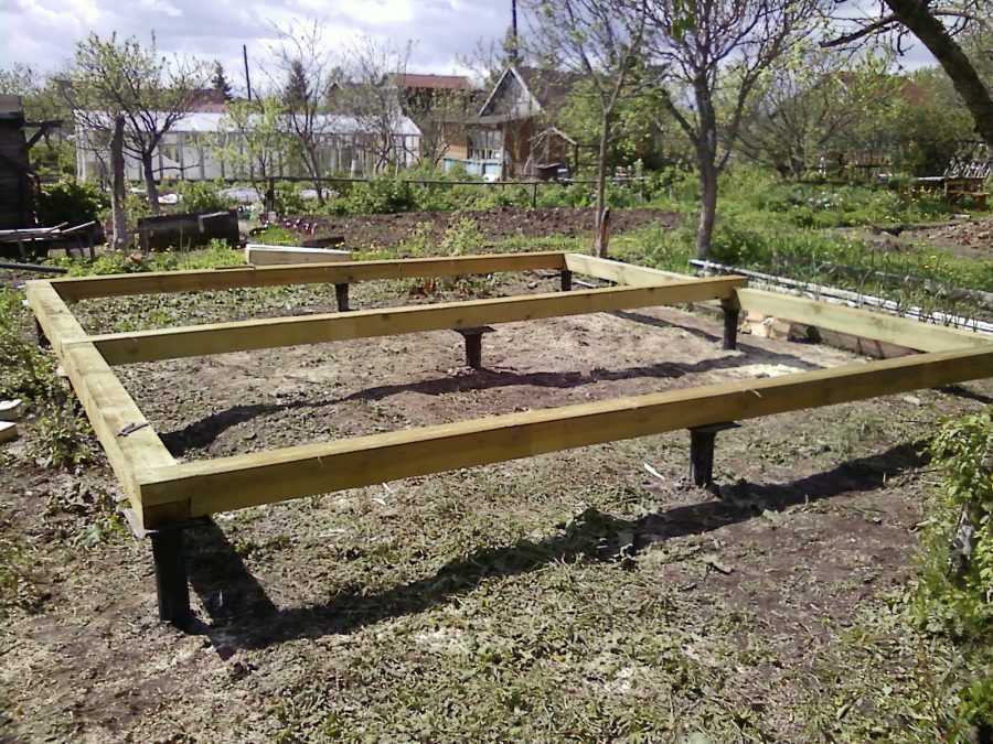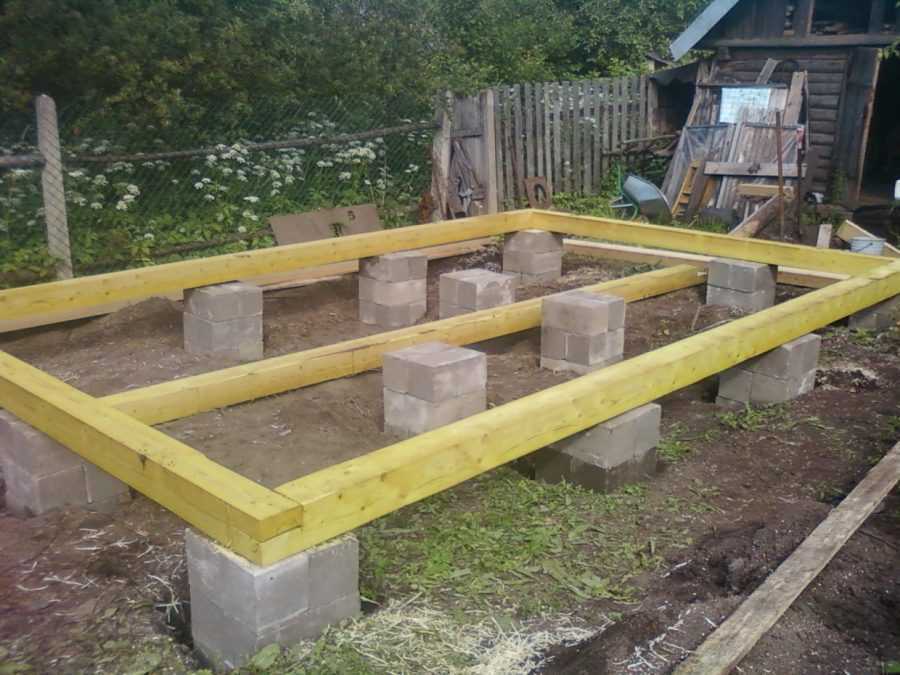 Причем столбы или ленты должны простилаться не только под стенами, но также в центре. Иначе напольный настил провиснет от нагрузки. А если внутри хозблока будут находиться верстак, станки или печка, то к столбам и ленте придется пристраивать дополнительный монолитный фундамент в виде плит.