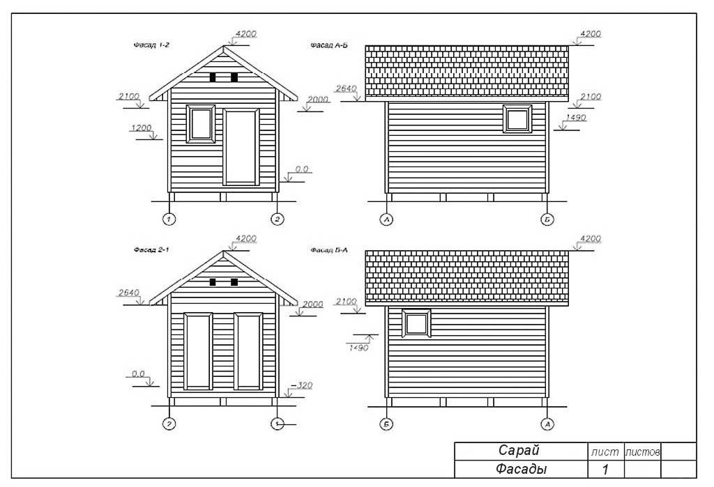 Сарай – легкое быстровозводимое не отапливаемое нежилое строение, из чего следуют важные облегчающие дело следствия. О них для строительства речь впереди, а пока нужно знать, что при оформлении/узаконивании наибольших придирок и сложностей следует ожидать по привязке на местности в соответствии с СанПиНами. Собственно проект сарая должен включать в себя листы с фасадами, план с разрезами, см. след 2 рис. и план-схему фундамента со спецификацией материалов на него, как на рис. с план-разрезами.