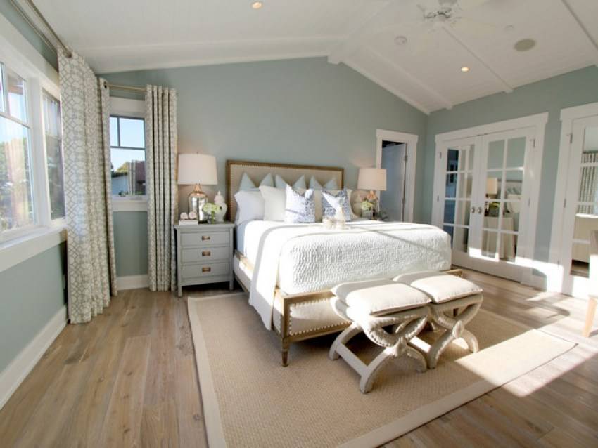 Синий цвет на полу и потолке гарантированно делает комнату яркой и самобытной. Он может объединять стены и потолок или оттенять верх спальни. Особенно эффектно смотрится помещение неправильной формы, выкрашенное лишь частично: например, мансарда с покатой крышей.