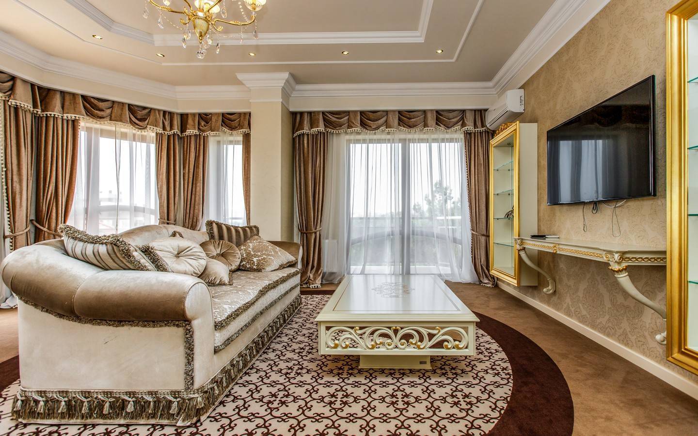 Гостиная в классическом стиле с красно-оранжевыми портьерамиИсточник mab.by