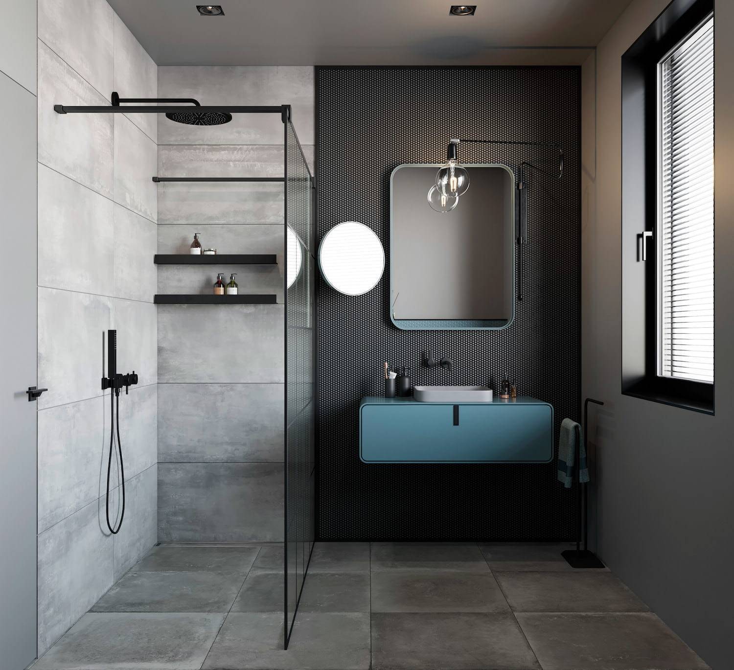 Подобная цветовая гамма представляет собой довольно практичный вариант для ванной комнаты, так как на серых поверхностях меньше видны загрязнения и разводы