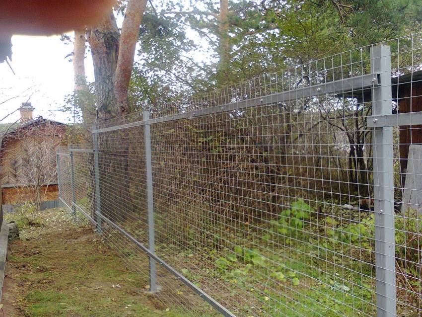 Другой вариант даёт чуть более изящный результат. Из стального уголка 20 мм свариваются квадраты размером 1,9×1,9 м², на них натягивается сетка. Каждый такой квадрат крепится на кронштейнах между двумя столбами.