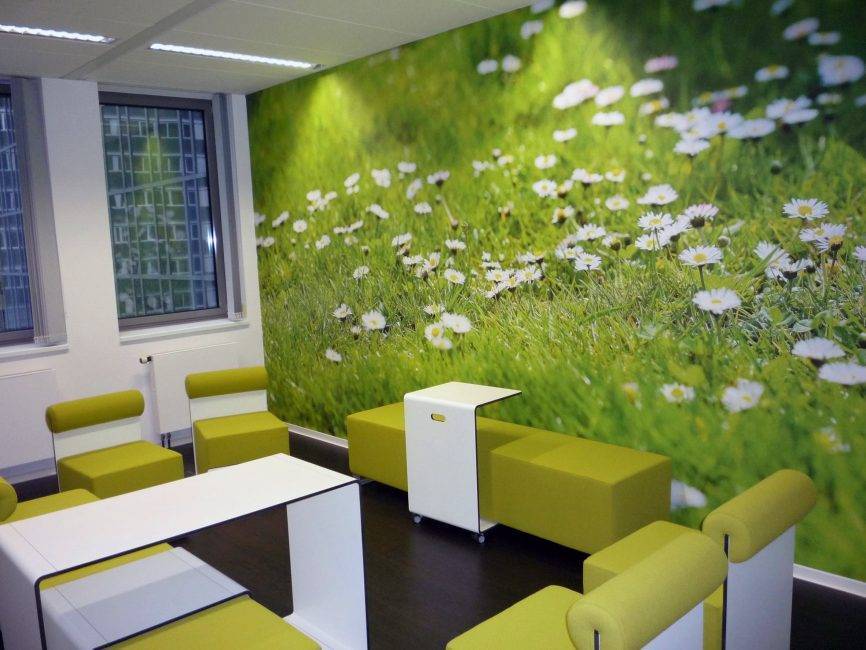 Обычно фотообоями оформляется обеденная зона. В числе сюжетов, которые популярны – городские пейзажи и природа.