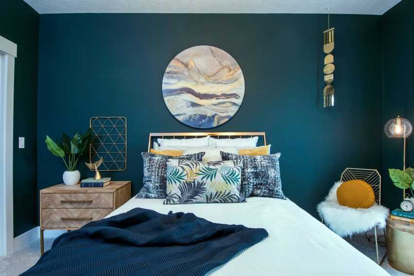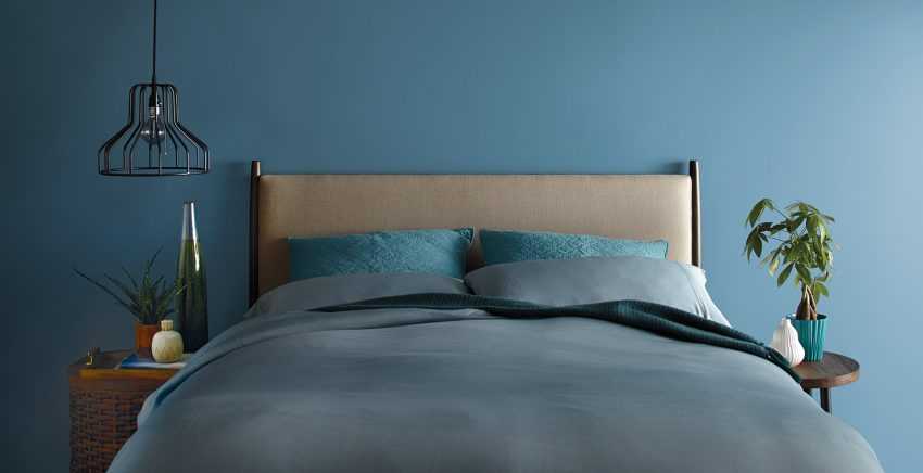 Более темная палитра, сочетающая в себе прохладные роскошные тона, идеально подойдет для отделки спален, выходящих окнами на юг. Очень красиво выглядят джинсовые, кобальтовые, темно-лазурные оттенки. Сравнительная новинка в мире дизайнов интерьера – цвет «Воды пляжа Бонди». Этот необычный оттенок, своеобразный микс между ярко-синим и цветом морской волны, придется по вкусу тем, кто любит оригинальность.