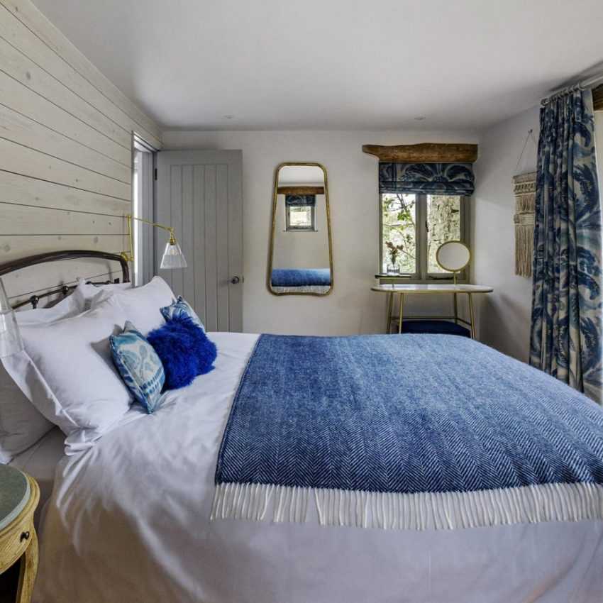 Сочетание голубого и белого создаёт ощущение прохлады в спальне