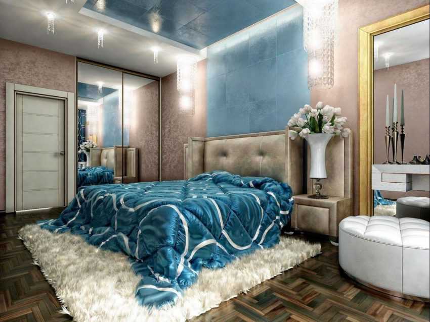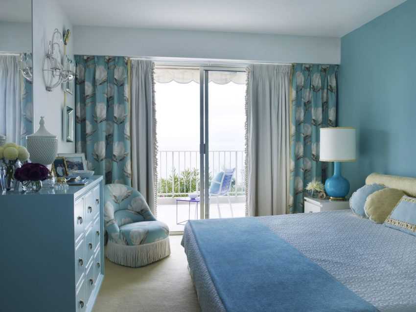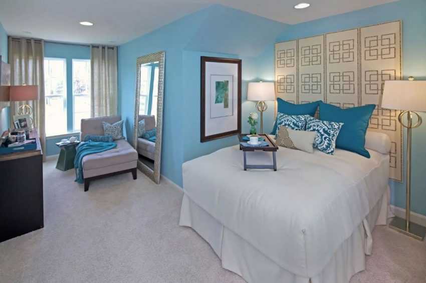 Чаще всего дизайнеры для оформления спальни используют бирюзовый цвет, небесно-голубой и аквамарин.
