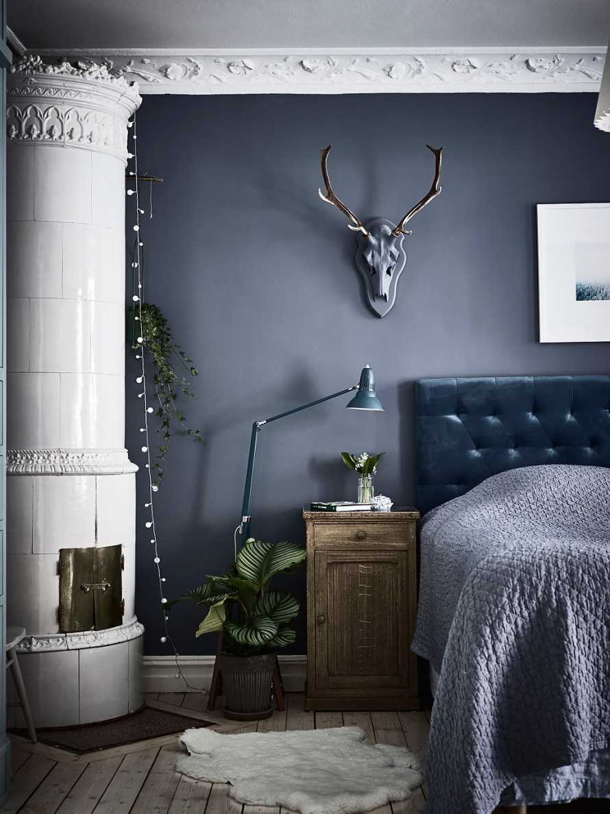 Этот современный стиль совмещает в себе простоту и функциональность. Для отделки стен, как правило, используются приглушенные оттенки синего. Отлично дополнят такой интерьер светлые шторы из натуральных тканей. Использование синего цвета в спальне, оформленной в скандинавском стиле, делает ее просторной и уютной.