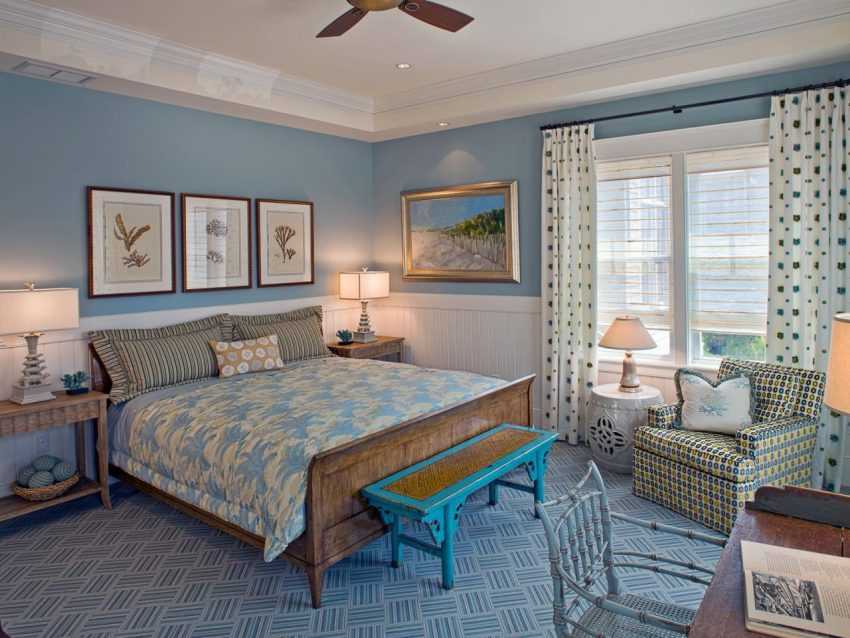 Синий цвет создает убаюкивающую атмосферу в комнате и будет склонять ко сну. Хорошим интерьерным решением будет частичная отделка стен, например над изголовьем кровати. Так же можно сделать несколько акцентов на светлом фоне, например бледно-синие портьеры в сочетании с подушками или покрывалом. Для создания светлого, легкого морского дизайна лучшей идеей будет сине-белая палитра.
