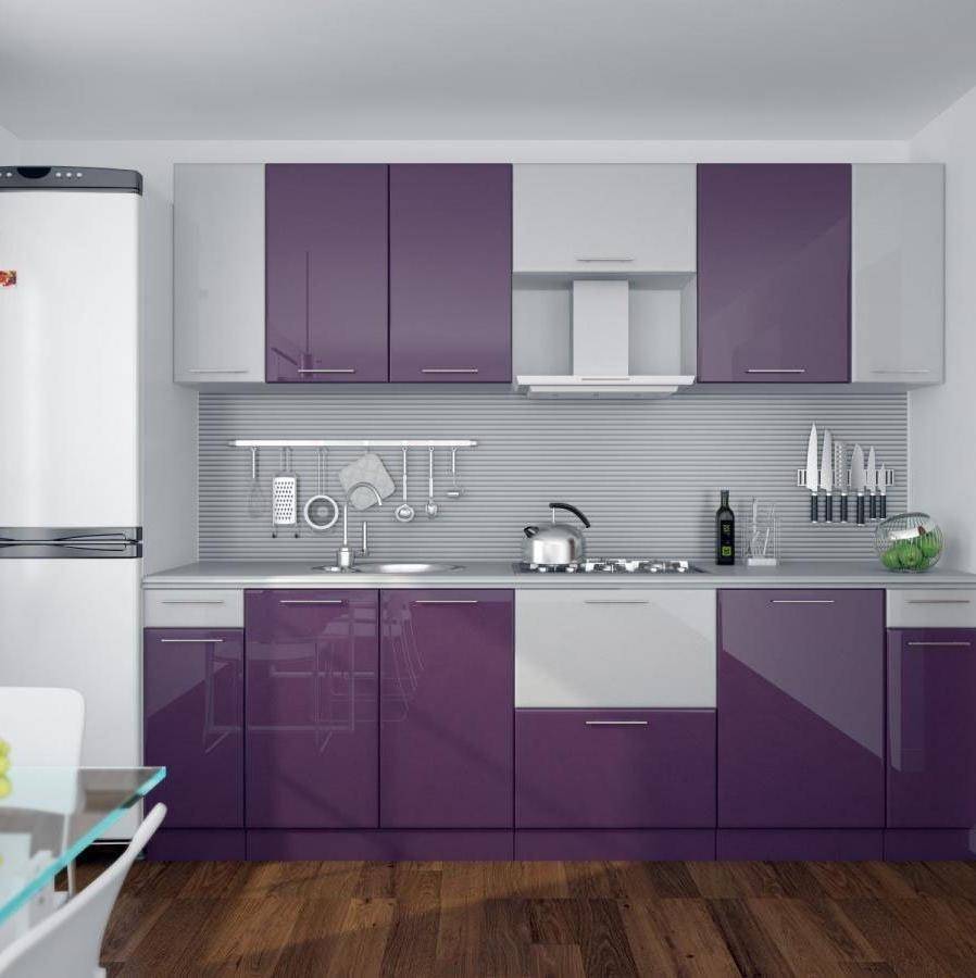 стиль авангард предполагает мебель строгих форм и с однотонными фасадами, контрастность цветов, один светлый оттенок и два ярких, а в качестве дополнительного часто используется чёрный. Поэтому для авангарда подойдёт фиолетовый гарнитур, который хорошо сочетается с белыми стенами и жёлтым фартуком;