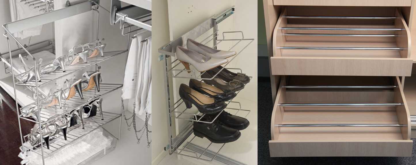 Чаще всего в шкафу места недостаточно. Даже если они имеет приличные размеры. Потому наполнение шкафа купе стараются разработать так, чтобы имеющиеся объемы использовались рационально. Например, вместо традиционных полок под обувь (сетчатых или из ДСП) можно поставить выдвижную обувницу. В них отлично размещается невысокая обувь — туфли, босоножки, ботинки.