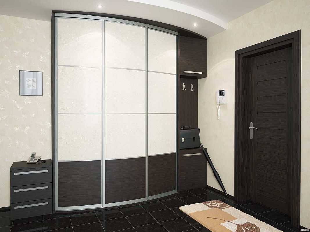 - выпуклая — наиболее часто такой формой обладает встроенный шкаф, устанавливающийся в какой-либо нише. Он идеально подходит для участков, которые не пригодны для монтажа стандартных предметов интерьера. Такой шкаф купе радиусный часто выбирается для прихожей или небольшой кладовки, переделывающейся под небольшую гардеробную;