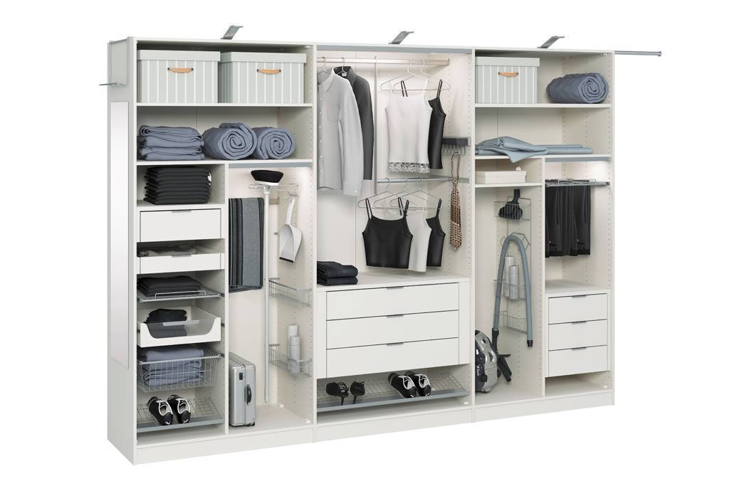 Существуют и полностью встроенные варианты, где на полозья крепятся раздвижные двери, за которыми на стенах фиксируются элементы системы хранения. Есть также частично встроенные модели, имеющие собственные пол или потолок.