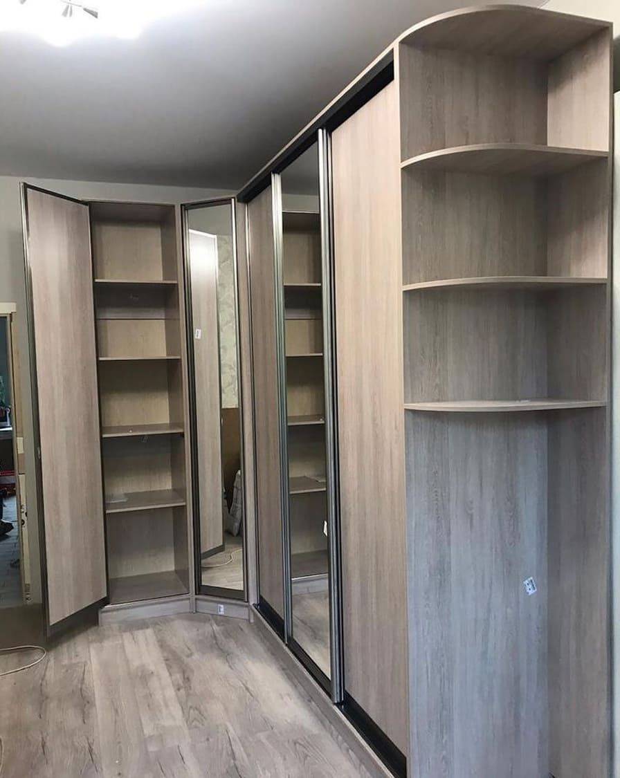 Шкафы нестандартной формы часто встраивают, разрабатывая их конфигурацию для конкретного помещения. Например, можно заказать модель со впуклым или выпуклым фасадом, треугольные, Г-образные и другие, в зависимости от интерьера спальной комнаты.
